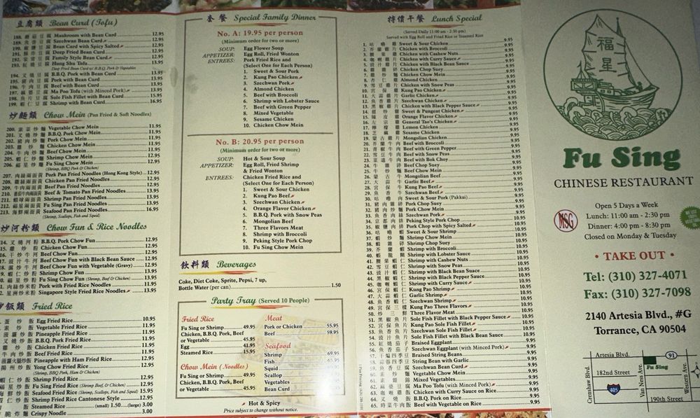 Fu Sing, a Chinese restaurant in Torrance, CA, offers a wide range of traditional dishes prepared with the finest ingredients. Known for its authentic and delicious menu, Fu Sing boasts favorites like Pork Eggrolls and Fu Sing fried rice. The servings are generous, perfect for sharing with family and friends in a Family Style setting. With a focus on quality and passion for Chinese culinary skills, each dish is a flavorful experience.